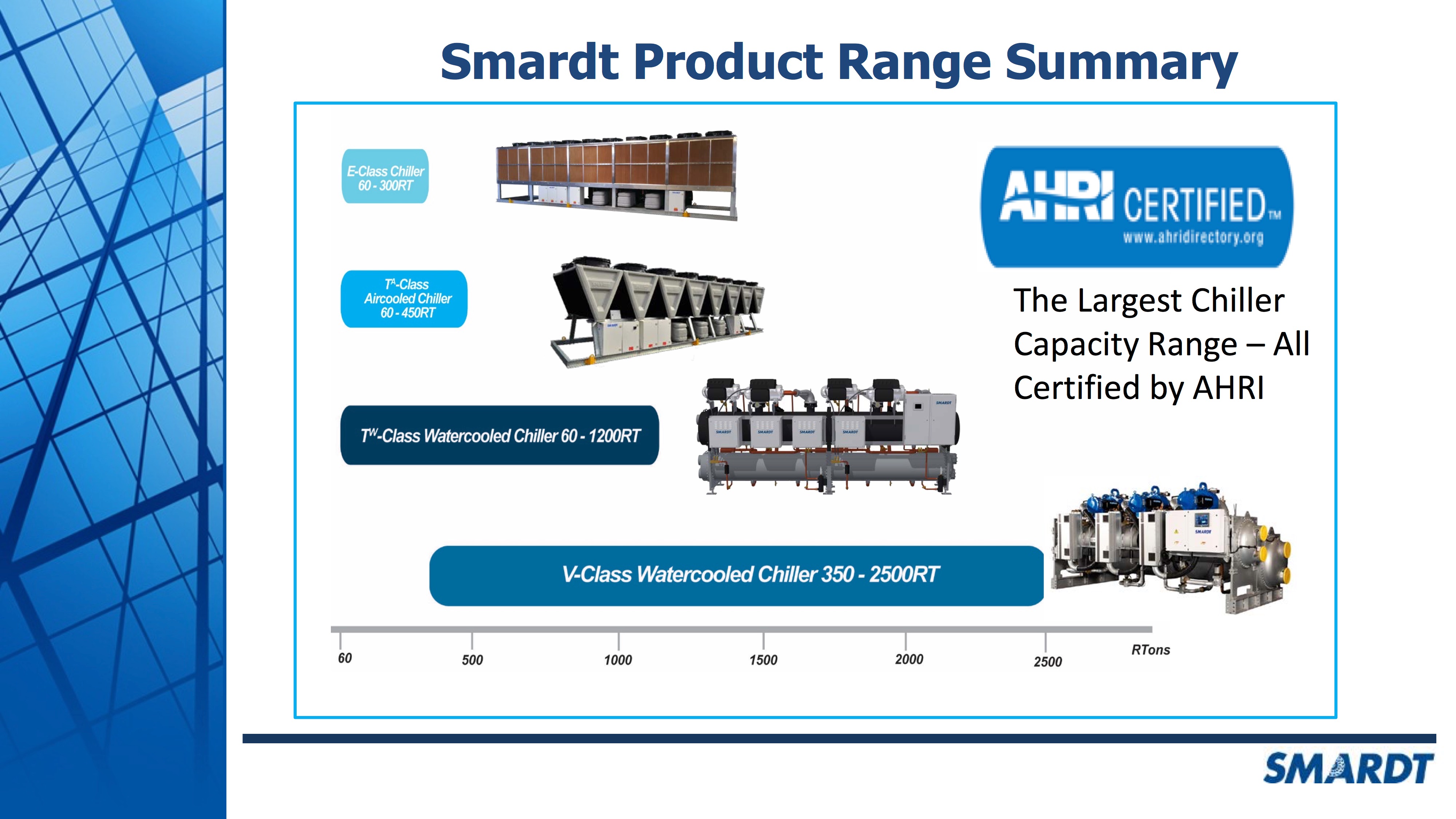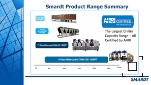 Smardt oil-free centrifugal chillers offer the highest IPLV energy efficiencies and the lowest lifetime operating costs in their capacity ranges - 200 kW through 8150 kW in water cooled, 200 kW through 1800 kW in air cooled and 200kW through 1320kW in evaporatively cooled.